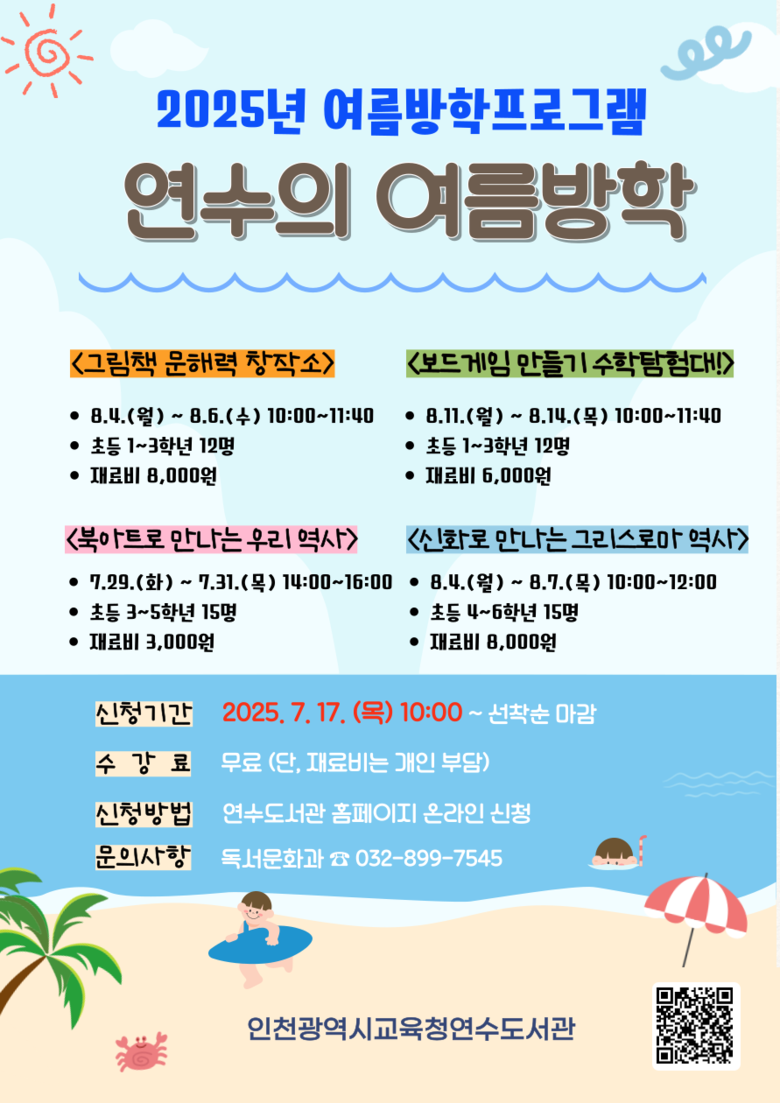 수강 신청은 7월 17일(목) 오전 10시부터 연수도서관 누리집에서 선착순으로 진행된다. 자세한 사항은 연수도서관 독서문화과(☎032-899-7545)로 문의하면 된다.