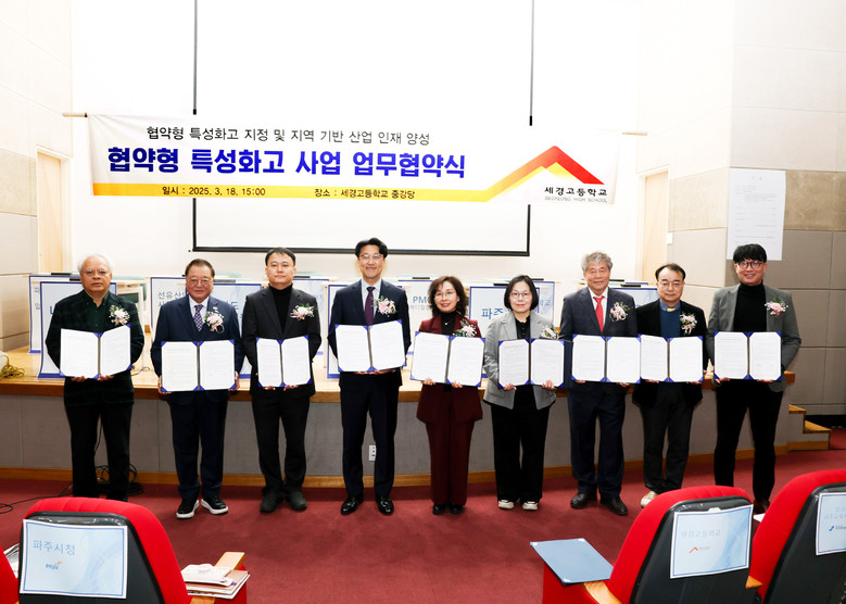 [파주시 세계타임즈=송민수 기자] 세경고등학교(교장 장계홍)는 협약형 특성화고 사업 육성을 위한 업무협약을 지난 18일에 개최했다. 이번 협약은 세경고등학교를 포함하여 파주시청(시장 김경일), 경기도파주교육지원청(교육장 전선아), 파주상공회의소(회장 박종찬),대한상공회의소 경기인력개발원(원장 양재덕), LG유플러스(대표 황현식), PMC파주메디컬클러스터(대표 고주혁), 선유산업단지 사업협동조합(회장 한영돈), 파주국가산업단지 경영자협의회(회장 류재철), 파주출판문화정보국가산업단지 입주기업체협의회(회장 정병철), 두원공과대학(총장 임해규), 서영대학교(총장 김정수) 등 지자체, 교육청, 지역 유관기관, 교육기관, 기업 단체 등이 참석하여 AI 분야 협약형 특성화고 사업을 통해 지역과 함께하고 성장하고 지역에 우수한 인재를 양성하여 지역에 정주하기 위한 목표와 비전을 수립하는 자리를 가졌다.