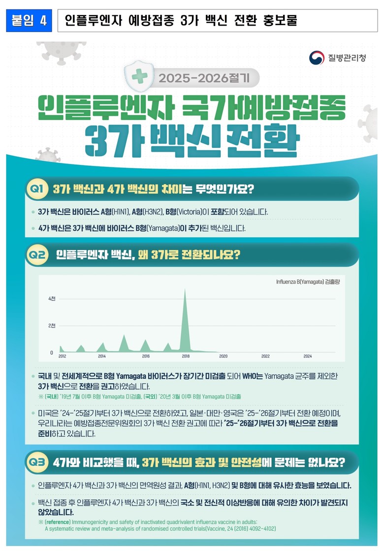이번 예방접종은 다가오는 겨울철 인플루엔자 유행에 대비하여, 감염될 경우 중증화 위험이 큰 어린이(생후 6개월~13세), 임신부, 어르신(65세 이상)을 대상으로, 기존 4가 백신에서 3가 백신*으로 변경되어 시행된다.