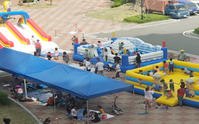 부영그룹이 이번에 마련한 지역사회 연계한 프로그램은 지난 여름 물놀이 체험장의 연속이다. 가을을 맞아 재미를 더하기 위해 에어바운스 놀이터를 설치한 것. 에어바운스는 판다, 뽀로로, 미니언즈, 광대 등 각종 모형의 공기주입식 놀이 체험 기구로, 아이들의 눈높이에 잘 어울린다. ‘뽀통령’으로 불리는 뽀로로 캐릭터 등장에 아이들은 기쁜 기색을 감추지 못했다. 아이들은 마음껏 에어바운스 위에서 뛰어도 힘들지 않은 듯 마냥 신나하는 표정이었다. 아이들뿐만 아니라 주민들도 함께 참여, 마치 어울림 축제의 한마당을 보는 듯했다.