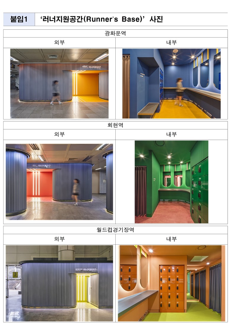 서울시와 서울교통공사는 ▴광화문역(5호선) ▴회현역(4호선) ▴월드컵경기장역(6호선)에 러닝 편의 및 여가문화 공간 「러너지원공간(Runner's Base)」을 조성했다고 밝혔다. 러닝을 돕는 지원시설뿐 아니라 모닝 러닝, 장거리 러닝 등 맞춤형 프로그램도 운영된다.