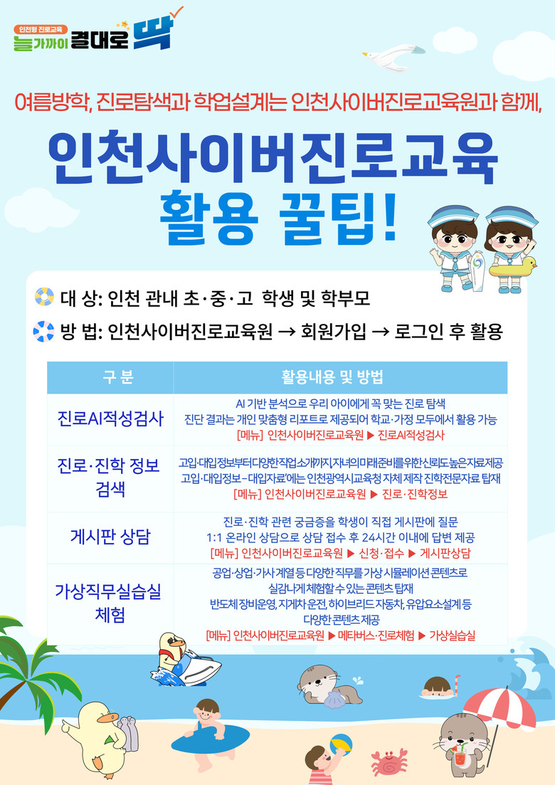 인천시교육청 관계자는 “미래를 준비하는 학생들이 인천사이버진로교육원을 많이 활용했으면 한다”며 “여름방학을 활용해 학생들이 자신의 꿈을 구체화하고 자신감 있게 진로를 설계하길 바란다”고 말했다.