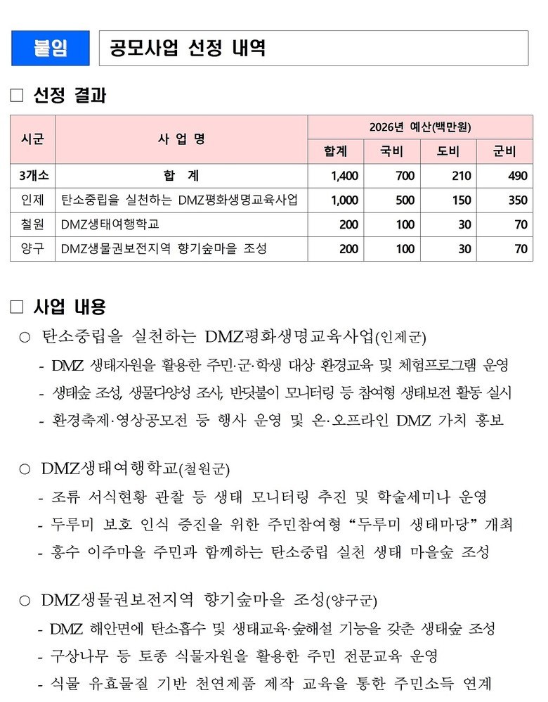 인제군 ‘탄소중립을 실천하는 DMZ평화생명교육사업(10억 원)’, 철원군 ‘DMZ생태여행학교(2억 원), 양구군 ‘DMZ생물권보전지역 향기숲마을 조성(2억 원)’이 각각 선정됐다.