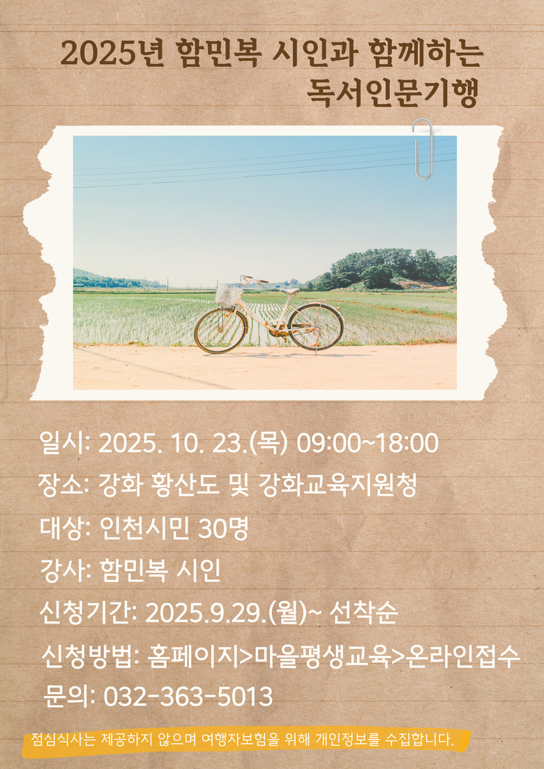 이어 강화교육지원청 미래교육지원센터에서 함민복 시인의 강연 ‘이 시대, 시를 읽고 쓰는 이유’와 시 쓰기 체험이 이어진다.