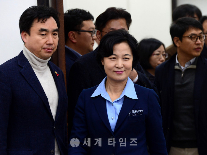 8일 오전 서울 여의도 국회 더불어민주당 당대표실에서 추미애 대표가 신년 기자회견을 하기 위해 입장하고 있다. 이날 추미애 대표는 기자회견에서 "오늘부터 당내 대선 경선 룰 마련을 시작하겠다"며 "국민께 약속드린 적폐청산과 사회대개혁은 결국 정권교체로 시작될 수밖에 없다"고 밝혔다. 2017.01.08.