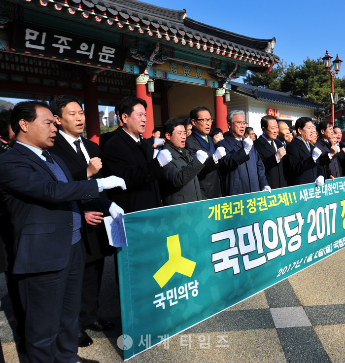 국민의당 호남지역 의원과 당직자들이 2일 오전 광주 북구 운정동 국립5·18민주묘지를 참배한 뒤 민주의 문 앞에서 정권교체 결의대회를 하고 있다. 2017.01.02