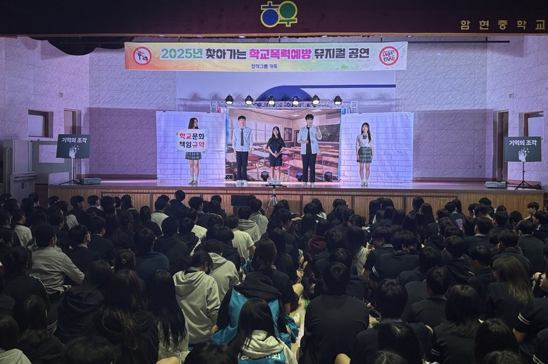 [시흥시 세계타임즈=송민수 기자] 함현중학교(교장 엄태헌)는 20일, 중학교 2·3학년 학생들을 대상으로 강당에서 See-興(보고 참여하여 흥겨운) 찾아가는 학교폭력 예방 공연으로 뮤지컬 ‘기억의 조각’을 관람했다. 이번 공연은 청소년 눈높이에 맞춘 관객 참여형 뮤지컬로, 창작그룹 가족 극단이 기획한 작품으로, 변화하는 학교폭력 예방 교육의 흐름에 맞춰 관계 회복과 실천 중심의 메시지 전달을 목표로 한다.