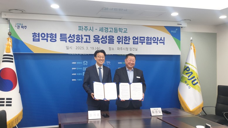 [파주시 세계타임즈=송민수 기자] 세경고등학교(교장 장계홍)는 파주시(시장 김경일)와 협약형 특성화고 육성을 위한 협약식을 3월 19일에 개최했다. 이번 협약식은 협약형 특성화고등학교 육성을 위한 상호 협력과 지자체와 함께 인재를 양성하고자 하는 데에 그 목적이 있다.