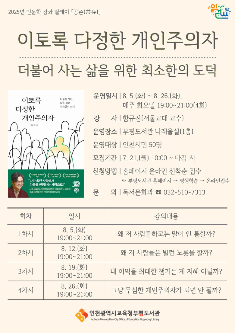올해 강좌의 주제는 ‘공존’으로, 부평도서관은 서울교육대학교 윤리교육과 함규진 교수의 ‘이토록 다정한 개인주의자’를 바탕으로 더불어 살아가기 위한 윤리적 태도와 철학적 성찰을 나누는 저자 강연을 마련했다.