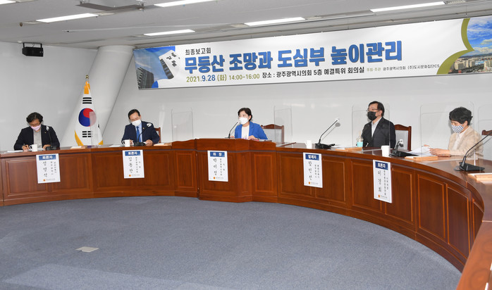 [광주=세계타임즈 손권일 기자] 광주광역시의회 김용집, 박미정, 김동찬, 김광란 의원은, 28일 시의회 5층 예결위원회 회의실에서 의원연구단체 ‘무등산 조망을 위한 도심부 높이 관리 방안 연구’용역의 결과물을 공유하고, 용역의 완성도를 높이기 위해 정책토론회를 개최하였다.