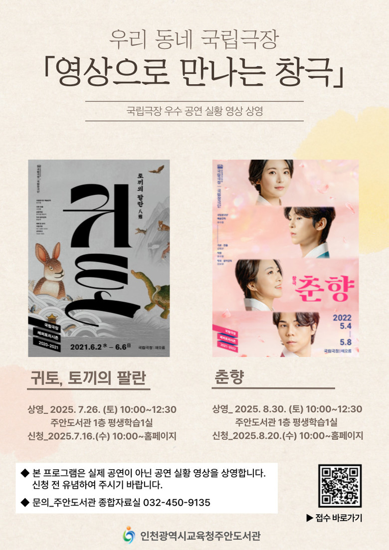 이번 프로그램은 공연예술 진입 장벽을 낮추고 시민들이 국립극장 우수 콘텐츠를 쉽게 접할 수 있도록 기획됐으며, 7월 26일에는 ‘귀토-토끼의 팔란’, 8월 30일에는 ‘춘향’ 공연 실황 영상이 상영된다.