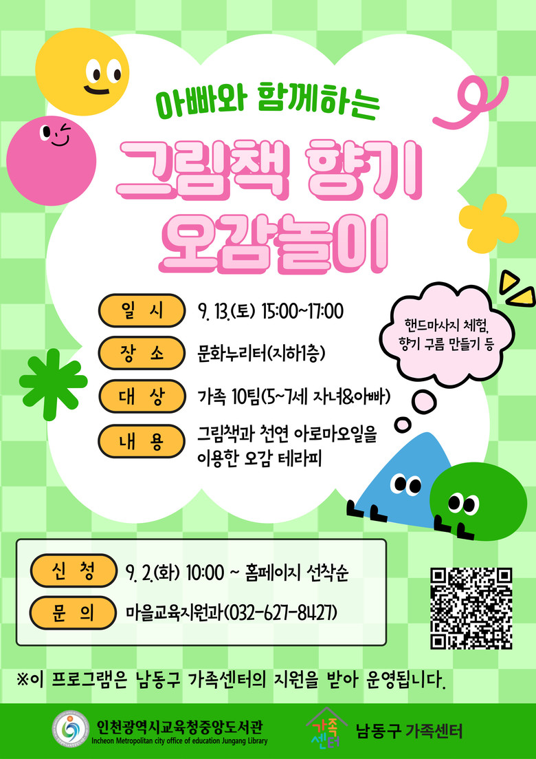 참가 신청은 9월 2일(화)부터 중앙도서관 누리집에서 선착순 진행하며, 5~7세 자녀와 아빠라면 누구나 참여할 수 있다.