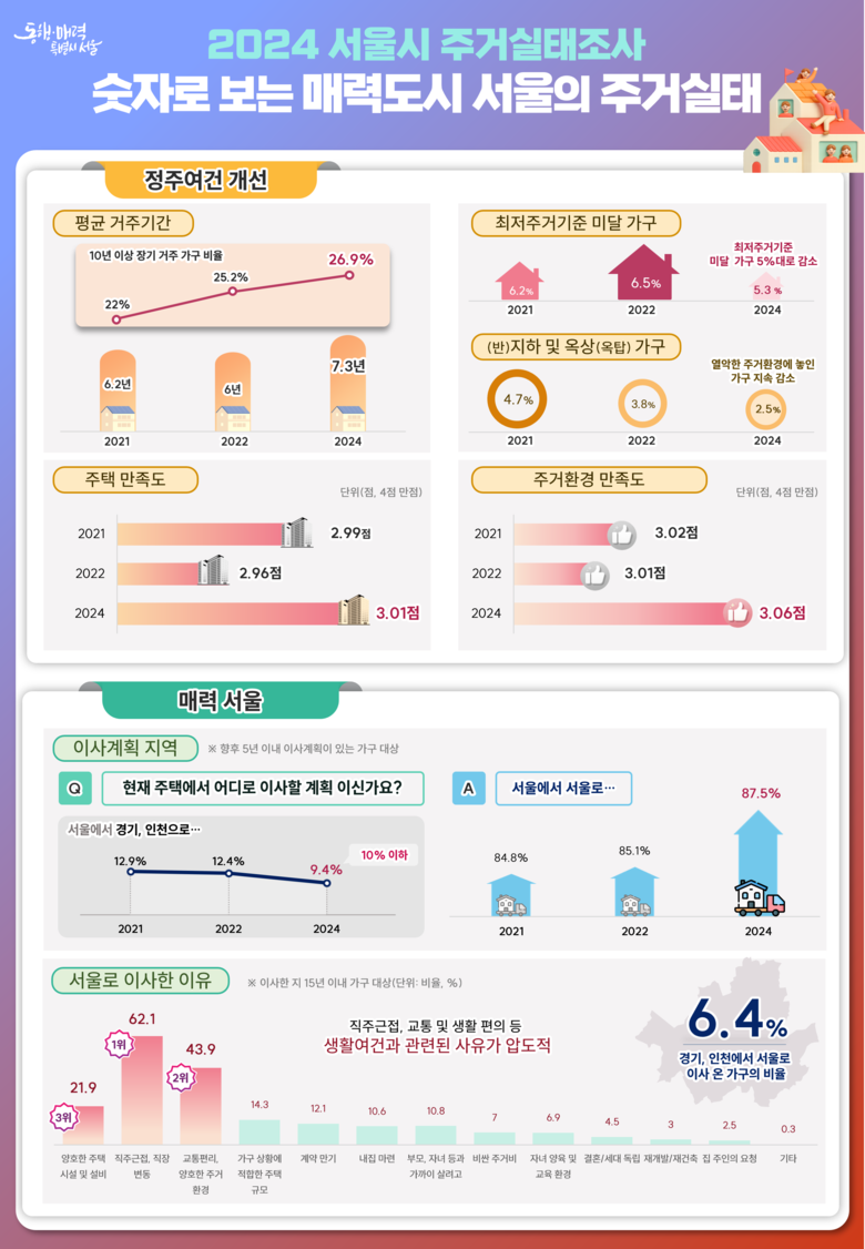 - 최저주거기준 미달 감소, 서울 내 이사계획 84.8%→87.5% 증가 ‘살고 싶은 도시’ 선호