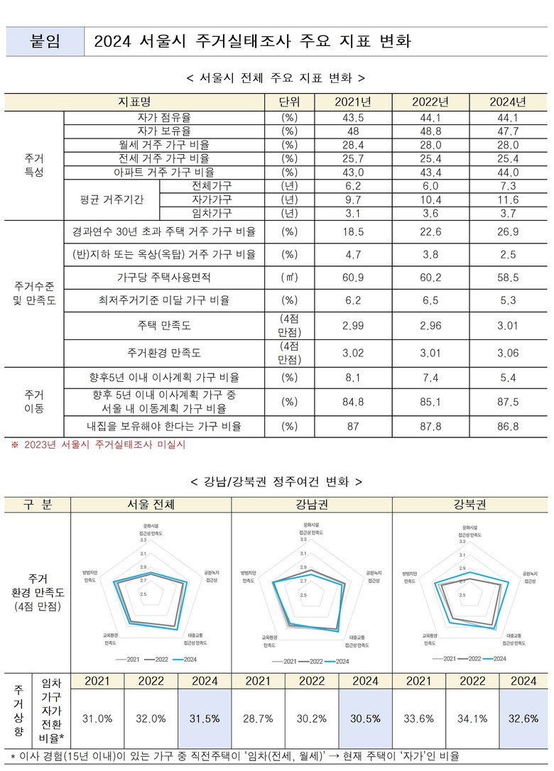 서울시는 ‘2024 서울시 주거실태조사’ 표본을 1만 5천 가구로 확대해 조사한 결과를 이같이 밝히고, 자치구별 주거실태 지표 11종을 최초로 공개해 지역 특성을 반영한 맞춤형 정책 수립 기반을 마련했다고 설명했다.