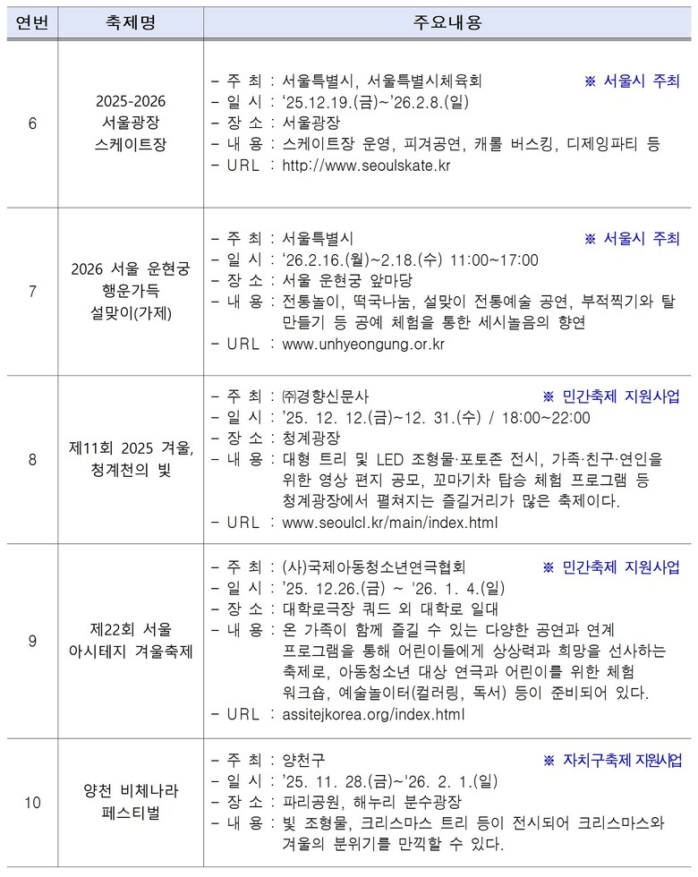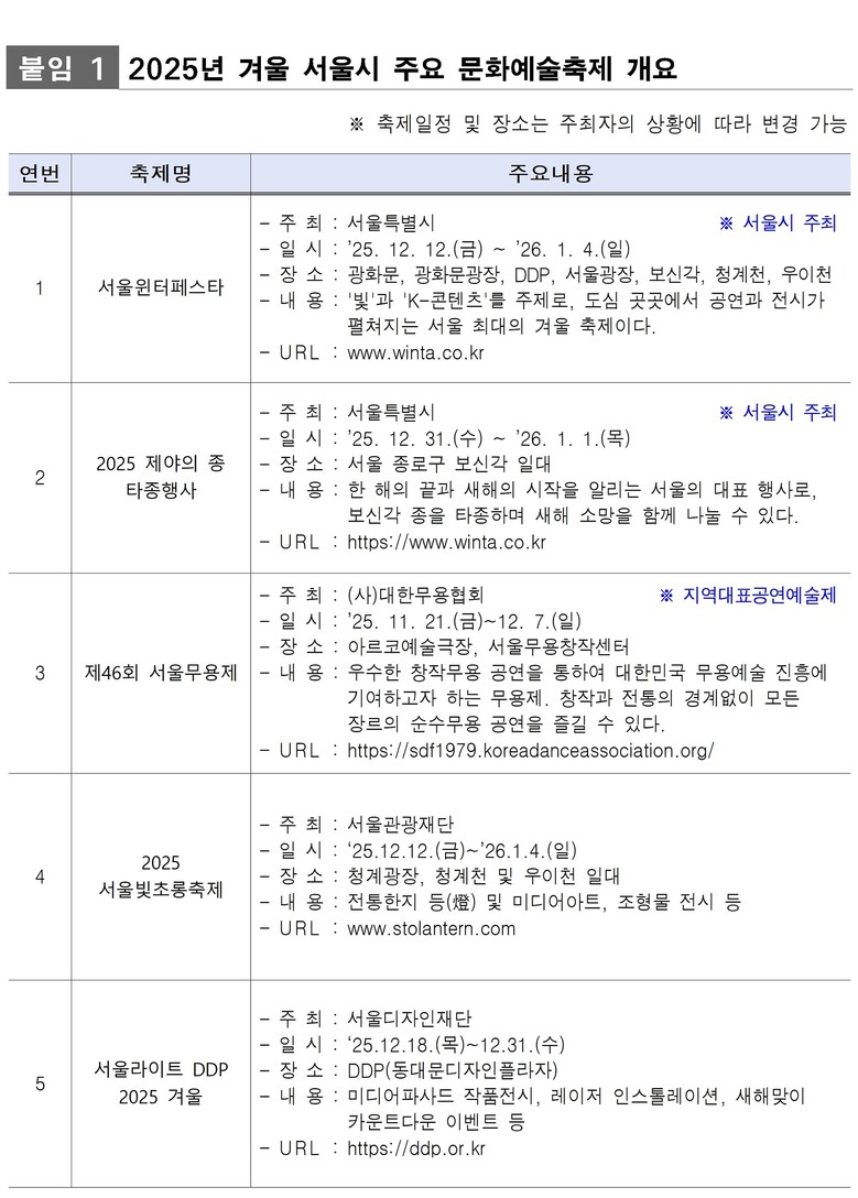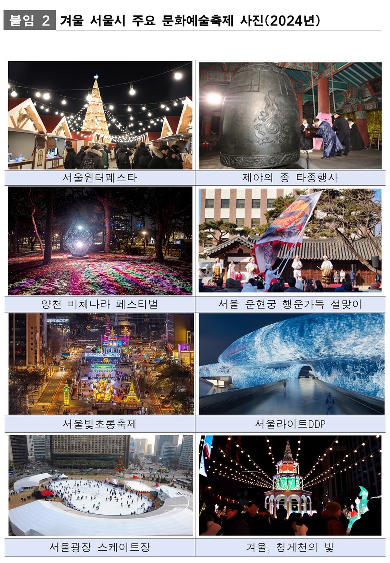 주요 축제로는 ‘빛’과 ‘K-콘텐츠’를 주제로 도심 곳곳에서 공연과 전시가 펼쳐지는 ▴서울윈터페스타(12.12.(금)~‘26.1.4.(일), 광화문, DDP, 청계천 등), 한해의 끝과 새해의 시작을 알리는 ▴2025년 제야의 종 타종행사(12.31.(수)~’26.1.1.(목), 보신각 일대)가 눈길을 끈다. 이외에도 다양한 무용공연을 즐길 수 있는 ▴제46회 서울무용제(11.21.(금)~12.7.(일), 아르코예술극장)와 전통놀이 및 공예체험을 통해 설날을 만끽할 수 있는 ▴2026 서울 운현궁 행운가득 설맞이(가제)(‘26.2.16.(월)~2.18.(수), 서울 운현궁 앞마당)도 열린다.