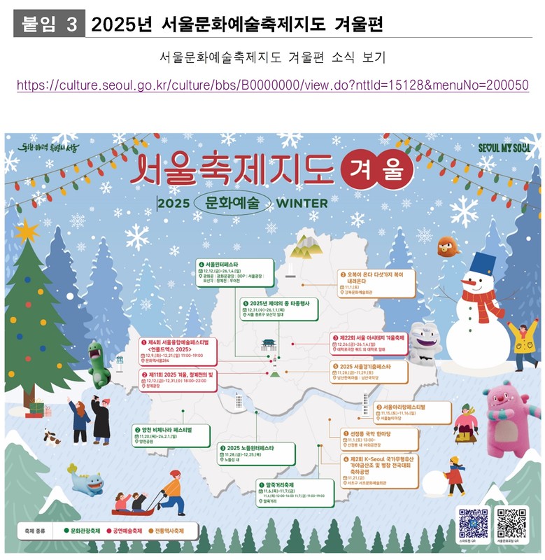 김태희 서울시 문화본부장은 “다가오는 연말연시, 서울 전역에서 펼쳐질 다채로운 겨울 축제를 보다 쉽고 편리하게 즐기실 수 있도록 <서울축제지도> 겨울편을 마련했다”라며 “앞으로도 계절별 축제 정보를 체계적으로 제공하고, 자치구 및 예술단체와의 긴밀한 협력을 통해 서울이 사계절 내내 문화가 흐르는 도시로 거듭날 수 있도록 지속적으로 힘쓰겠다”고 밝혔다.