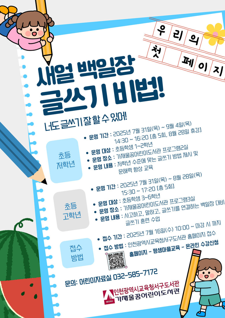 7월 16일 오전 10시부터 서구도서관 누리집(https://lib.ice.go.kr/seogu)에서 선착순 신청 가능하며, 자세한 사항은 서구도서관 누리집을 참고하거나 어린이자료실(☎032-585-7172)로 문의하면 된다.