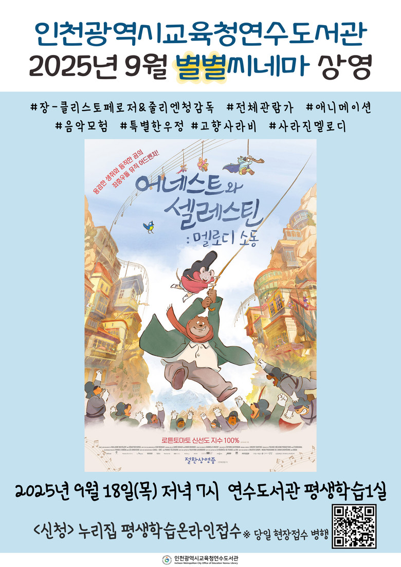 이번 상영작은 세상의 편견을 넘어선 곰 ‘어네스트’와 생쥐 ‘셀레스틴’의 음악 모험을 그린 작품으로, 그림책 작가 가브리엘 벵상 원작을 바탕으로 우정, 용기, 음악의 가치를 전한다.