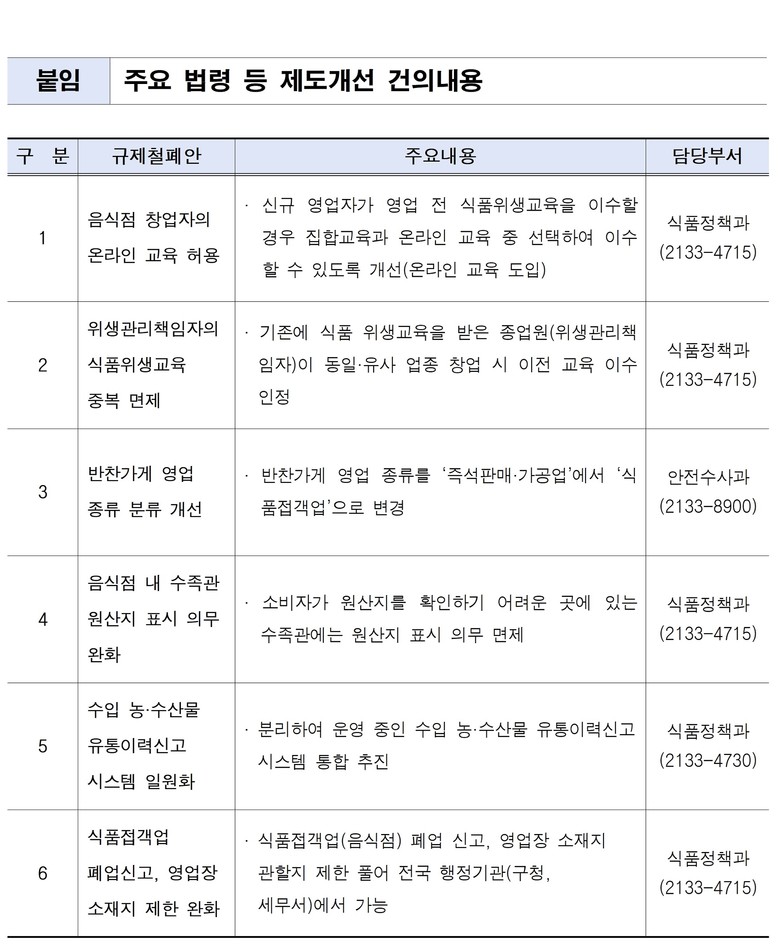 - 창업시 ‘온라인 식품위생교육’ 허용‧반찬가게도 일반음식점과 동일한 영업기준 적용 요청