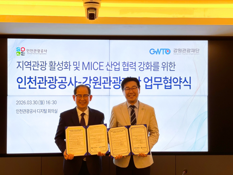 [강원도 세계타임즈=김민석 기자] 강원관광재단(대표이사 최성현, 이하 재단)이 수도권 관문 도시 인천과 협력하며 관광 및 MICE 산업 경쟁력 강화에 나섰다. 재단은 지난 3월 30일 인천관광공사와 지역관광 및 MICE 산업 활성화를 위한 업무협약을 체결했다고 밝혔다.