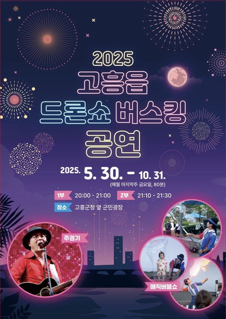 ‘군민과 하나되는 별밤 버스킹’을 주제로 한 이번 공연은, 4월부터 10월까지 매월 마지막 주 금요일 저녁 8시에 열리는 문화가 있는 날에 맞춰 기획됐다. 군민과 관광객에게 다양한 문화적 즐거움을 제공하고, 일상 속에서 문화예술을 향유할 수 있도록 마련된 프로그램이다.
