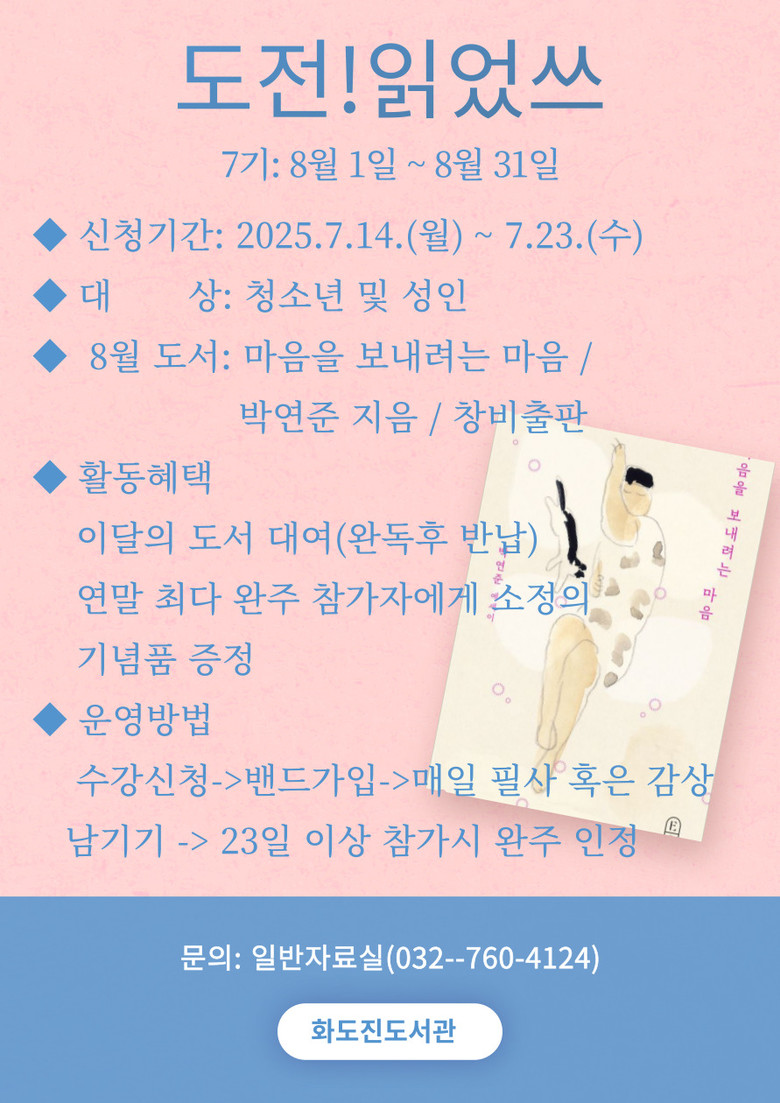 프로그램 관련 문의는 화도진도서관 일반자료실(☎760-4124)로 하면 된다.