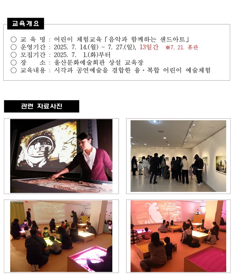 오는 7월 14일부터 27일까지, 상설 교육장에서 ‘음악과 함께하는 샌드아트’ 체험교육이 운영된다. 단, 7월 21일은 휴관이다.