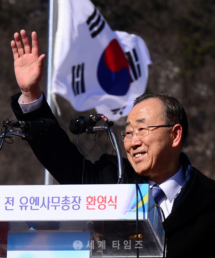 반기문 전 유엔 사무총장이 14일 오전 충북 음성 반기문 평화랜드에서 열린 환영행사에서 인사말을 한 후 주민을 향해 손을 흔들고 있다. 2017.01.14.