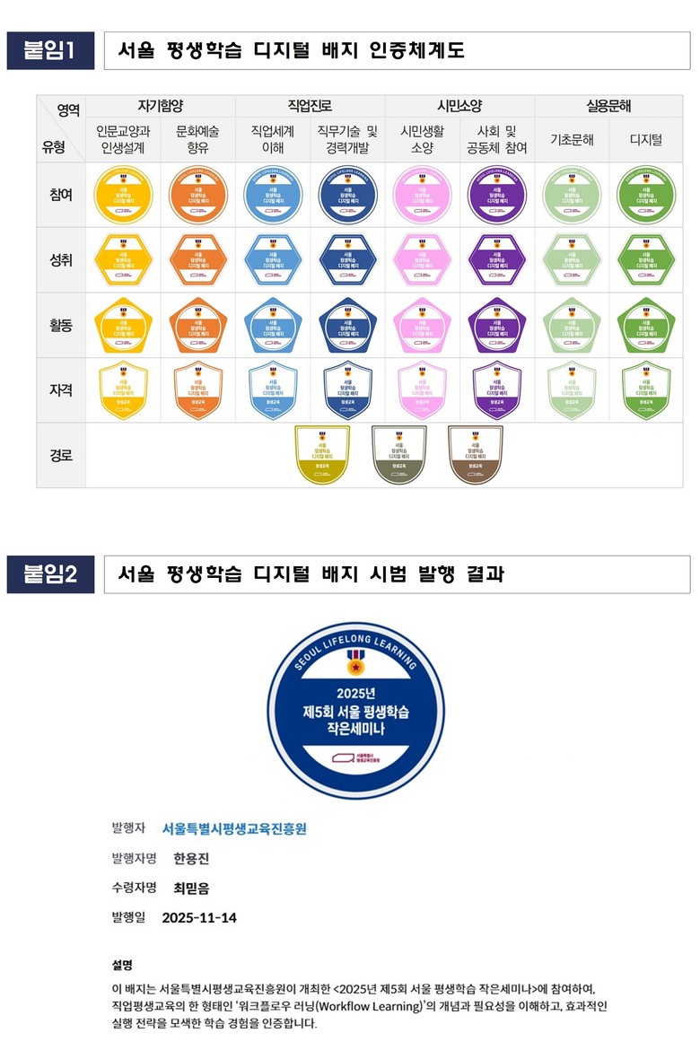 한용진 서울시평생교육진흥원장은 “디지털 배지는 학습 경험을 디지털화하여 체계적으로 축적·관리할 수 있는 수단”이라며, “앞으로 디지털 배지를 기반으로 모든 학습 경험이 자산이 되는 평생학습 데이터 생태계를 구축해 나가겠다”고 말했다.