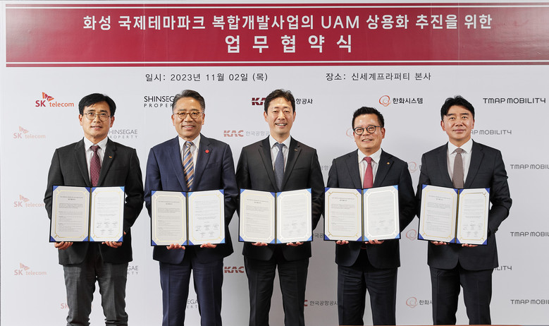 SKT·한국공항공사·한화시스템·티맵모빌리티가 참여하는 ‘K-UAM 드림팀’ 컨소시엄(이하 드림팀)이 신세계프라퍼티와 화성국제테마파크 도심항공교통(UAM) 사업 추진을 위한 업무협약(MOU)을 2일 체결했다.