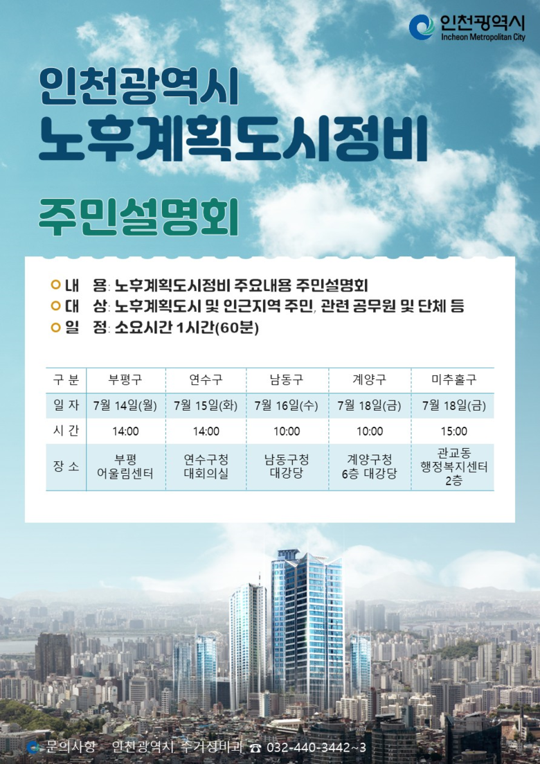 설명회는 부평구를 시작으로 연수구, 남동구, 계양구, 미추홀구 순으로 진행되며, 각 구청 대강당이나 행정복지센터 등에서 열린다. 참여 대상은 노후계획도시 주민은 물론, 인근지역 주민과 관련 공무원, 유관 단체 등이며, 구체적인 일정과 장소는 인천시 누리집을 통해 확인할 수 있다.