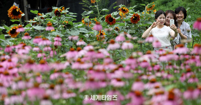 대전 동구 추동 대청호자연생태관과 대청호자연수변공원 일원이 2600여 본의 빨간 해바라기로 곱게 물들며, 때 이른 폭염과 장마에 지친 시민들에게 활력소가 되고 있다.
