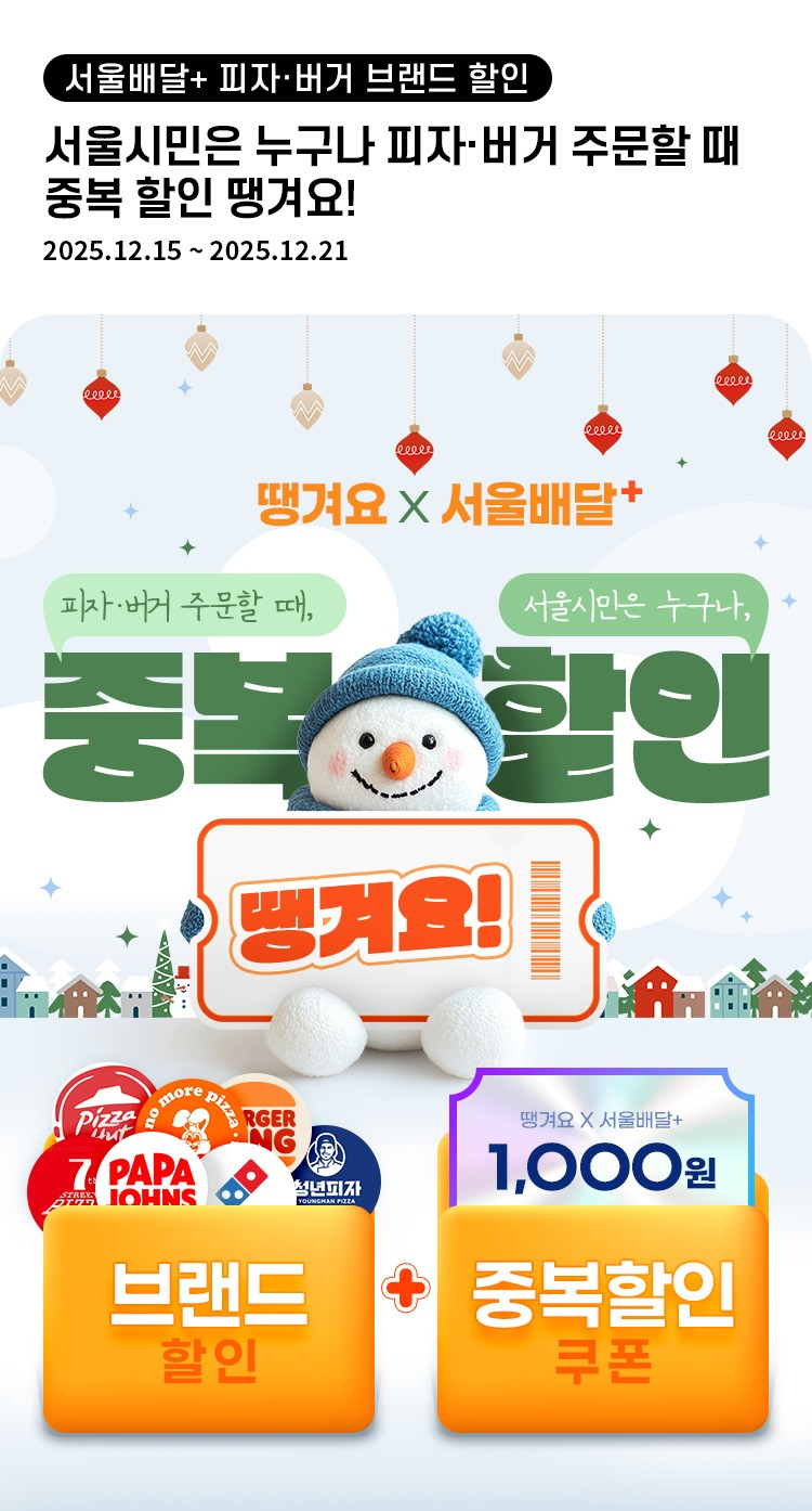 한편 피자헛, 도미노피자, 파파존스, 청년피자, 7번가피자, 노모어피자, 버거킹 등 7개 브랜드는 21일(일)까지 ‘땡겨요’를 통해 브랜드별 할인쿠폰을 발행하는 공동 프로모션을 추진한다.