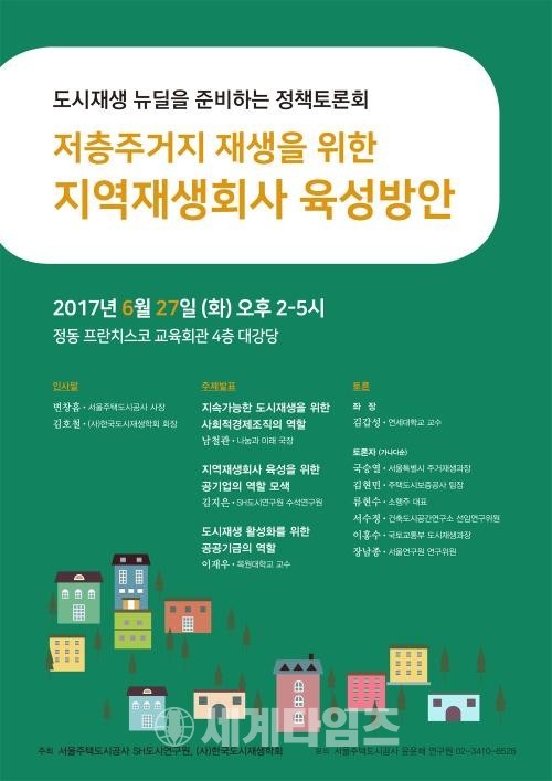 서울주택도시공사(SH공사)는 한국도시재생학회와 함께 27일 오후 서울 중구 정동 프란치스코 교육회관에서 '저층주거지 재생을 위한 지역재생회사 육성방안' 정책토론회를 개최한다고 이날 밝혔다.