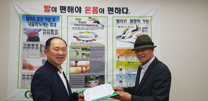 | ▲ (사)국민건강중앙회 권진철 회장(사진 오른쪽)과 바이오라이프 지병욱 사장이 MOU체결 후 포즈를 취하고 있다. |