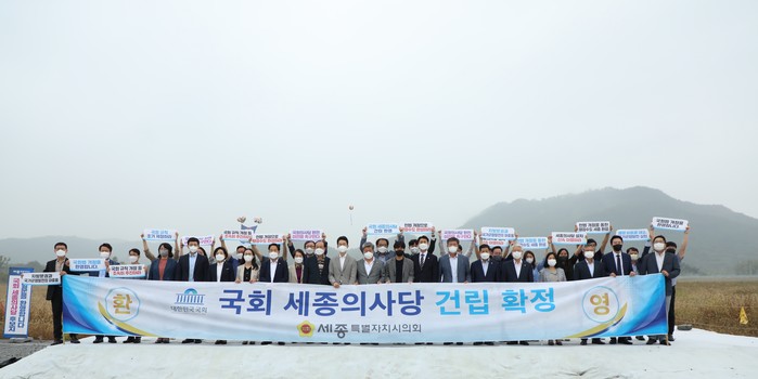 이어 세종시의회 의원들은 각자 손 피켓을 들고 국회 세종의사당 건립 확정을 환영하는 퍼포먼스를 펼쳤다.