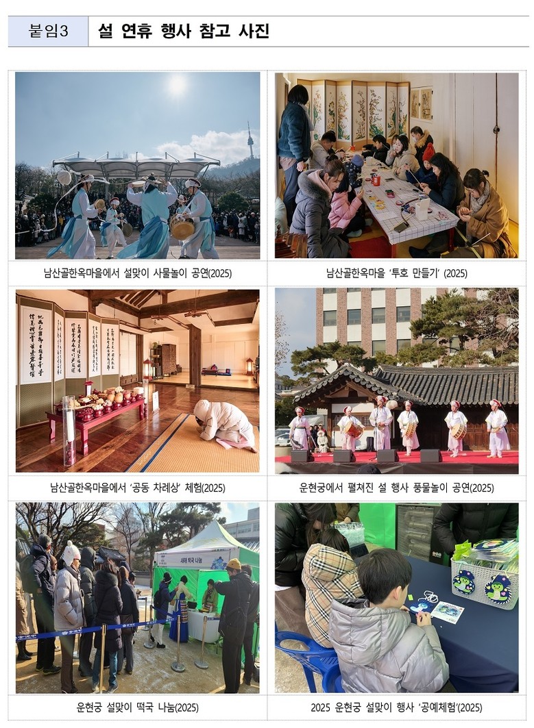 먼저 2.16.(월)~2.18.(수) 서울의 대표적 전통문화 공간인 ▴남산골한옥마을 ▴운현궁에서 세시풍속을 체험하는 설맞이 행사가 열린다. 떡국 나눔을 비롯한 다양한 전통 체험 프로그램과 공연이 마련돼 흥겨운 명절 분위기를 더할 예정이다.