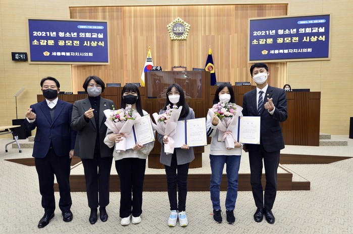 [세종=세계타임즈 이채봉 기자] 세종특별자치시의회(의장 이태환)는 22일 본회의장에서 ‘2021년 청소년 의회교실 소감문 공모전’ 시상식을 개최하고 우수작으로 뽑힌 6명에게 상장을 수여했다.