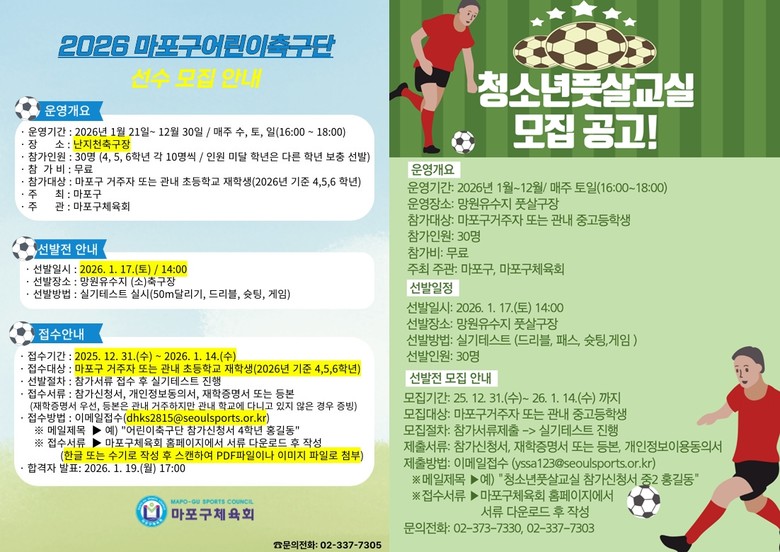 보다 자세한 사항은 02-373-7330(마포구체육회), 02-337-7303(청소년풋살교실), 02-337-7305(어린이축구단)로 문의하면 된다.
