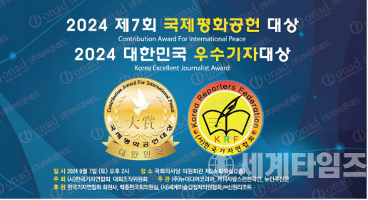 [세계타임즈 = 이진화 기자] 한국기자연합회(회장 이창열)는 오는 9월 7일 오후 2시 국회의원회관 제2소회의실에서 '제7회 국제평화공헌대상'과 '2024 대한민국우수기자대상' 시상식을 개최한다고 밝혔다.
