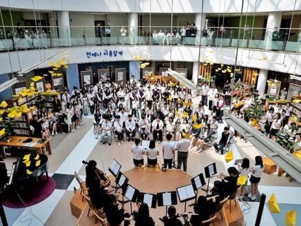 뒤이어 음악과 학생들의 관현악 합주에 맞추어 전교생이 함께 ‘천 개의 바람이 되어’를 제창하며 마음을 모았다.
