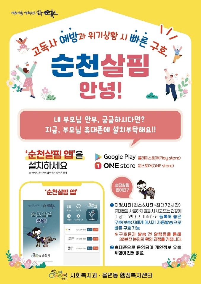 또한, 스마트폰을 활용한 ‘순천살핌 안녕 앱’과 가전제품 사용 여부를 감지해 응급 상황을 파악하는‘스마트 돌봄 플러그’도 운영 중이다.
