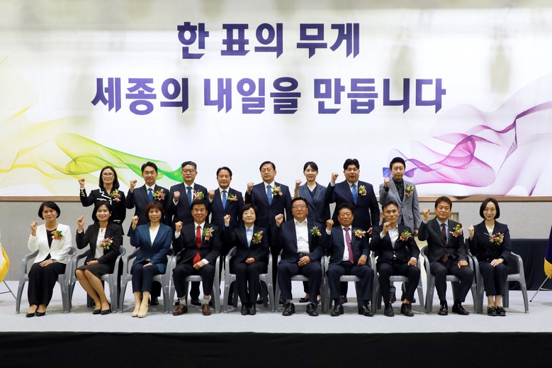 [세계타임즈=세종 이채봉 기자] 1일 실시된 제8회 전국동시지방선거 개표 종료 직후 제4대 세종특별자치시의회 의원으로 선출된 당선인들이 한자리에 모였다.