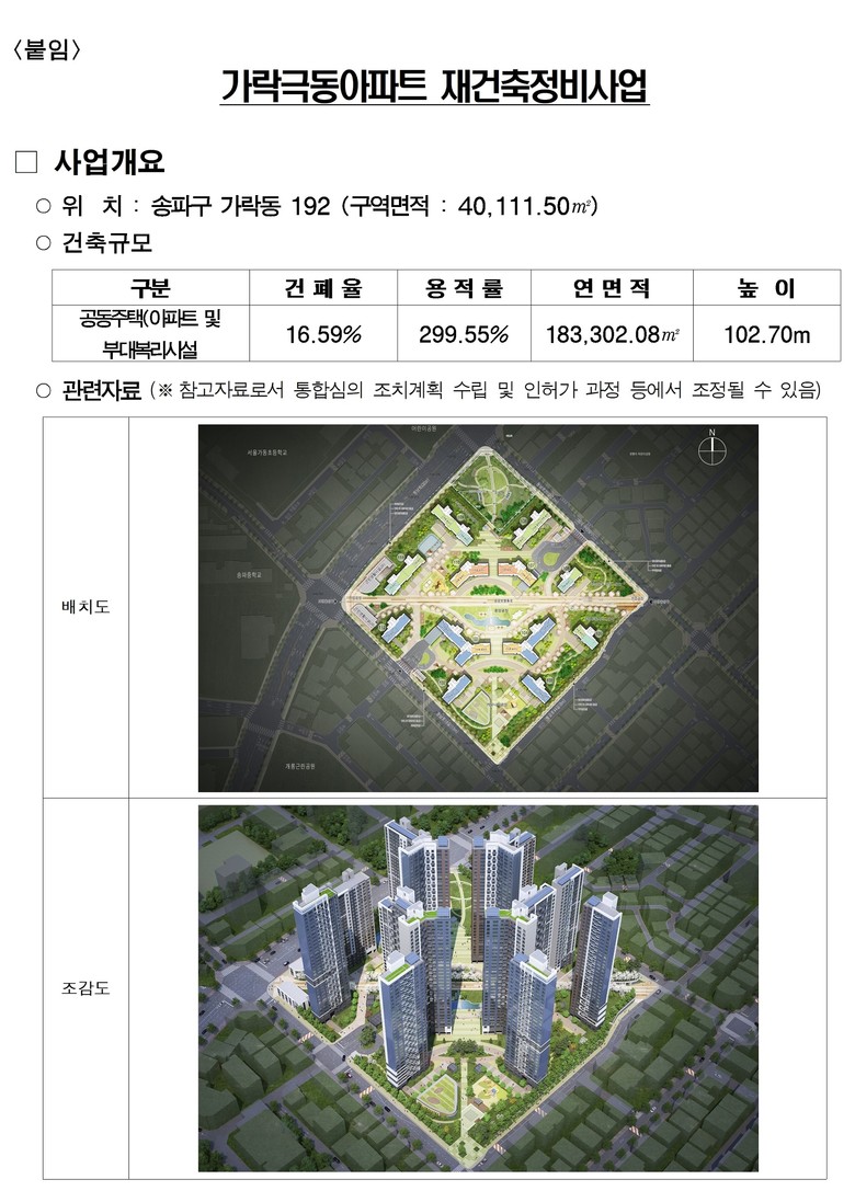 서울시는 12월 29일 제14차 정비사업 통합심의위원회에서 가락극동아파트 재건축정비사업에 대한 통합 심의를 ‘조건부의결’했다고 밝혔다.