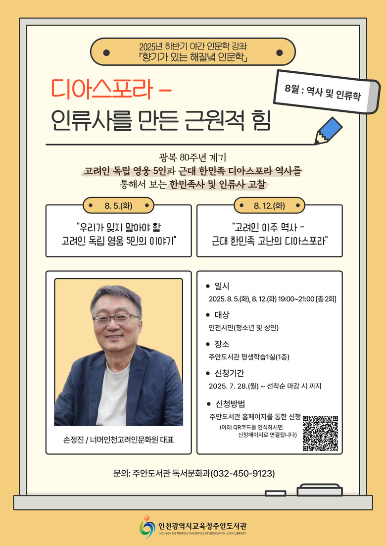 수강 신청은 7월 28일(월)부터 주안도서관 누리집(https://lib.ice.go.kr/juan)에서 가능하며, 자세한 내용은 주안도서관 공지사항 또는 독서문화과(☎032-450-9123)로 문의하면 된다.