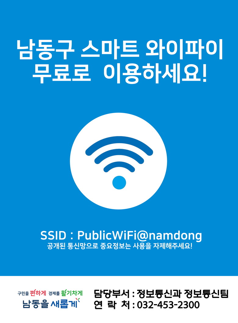 박종효 남동구청장은 “무료 공공와이파이 확대 구축은 정보 소외 계층의 디지털 격차를 해소하고 구민들의 가계 통신비 부담을 더는 실질적인 통신 복지 서비스가 될 것”이라며 “앞으로도 구민들이 체감할 수 있는 스마트 도시 구현을 위해 최선을 다하겠다.”라고 전했다.