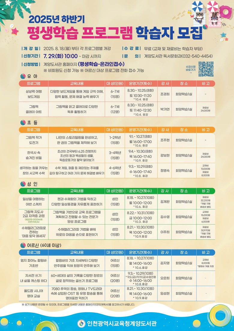 수강 신청은 7월 29일(화) 오전 10시부터 계양도서관 누리집에서 선착순 접수하며, 수강료는 무료(재료비 본인 부담)이다.