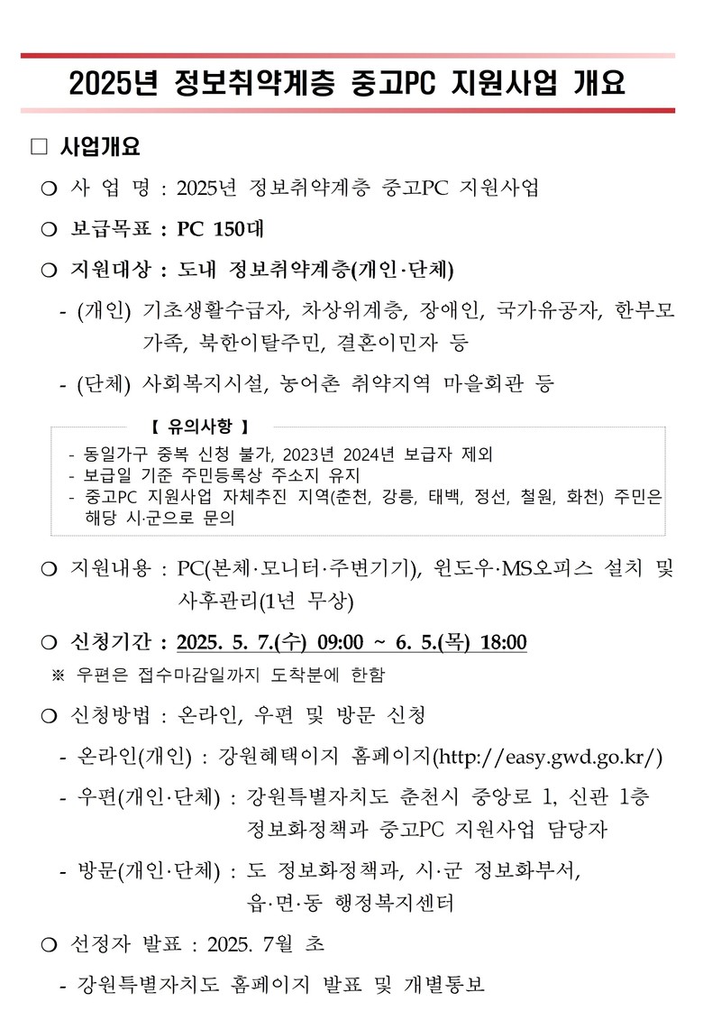 강원특별자치도 관계자는 “이번 사업을 통해 정보취약계층의 디지털 접근성을 높이고, 자원 재활용을 통한 친환경 사회 구현에도 기여할 것”이라며, “많은 관심과 참여를 부탁드린다”고 말했다.