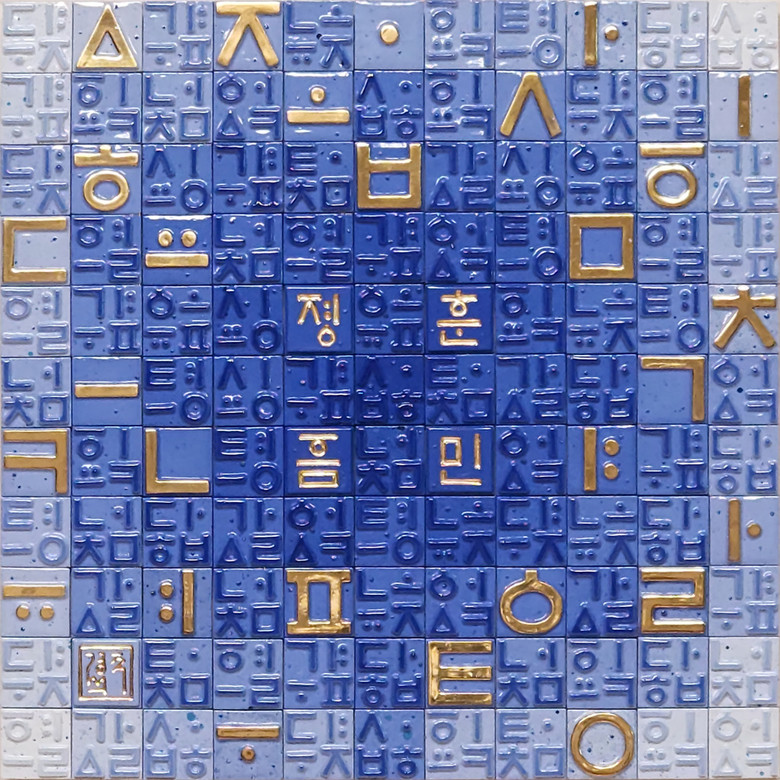 작품명 ‘훈민정음 BG100’은 126x126cm 크기의 대형작품으로 청화 22단계 색 농도의 그라데이션을 적용하여 제작한 961개의 사각 도자 타일로 구성된 한글 자모 28자의 양각과, 고딕체로 디자인된 훈민정음 음각 타일을 빈틈없이 조화롭게 배열하여 제작되었다.