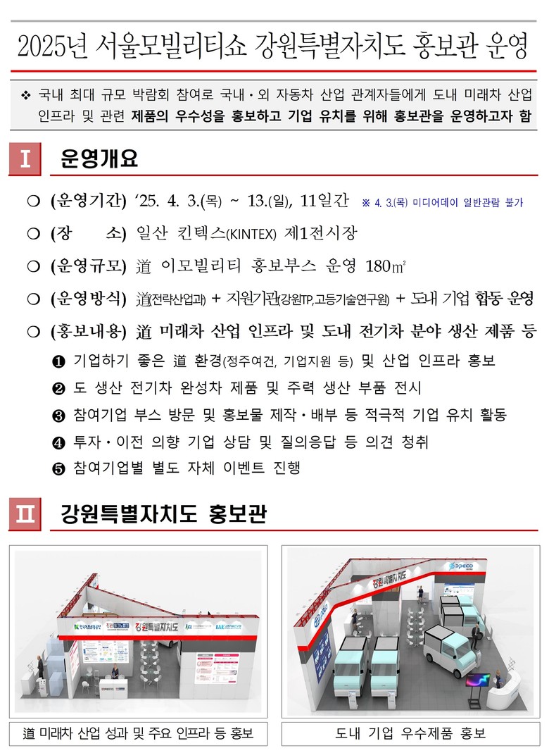강원자치도는 이번 전시에서 강원테크노파크, 고등기술연구원 등 도내 연구‧지원기관과 공동으로 홍보관을 구성하고, 미래차 산업의 핵심 인프라와 도내 유망 기업들의 우수제품을 집중 홍보할 계획이다.